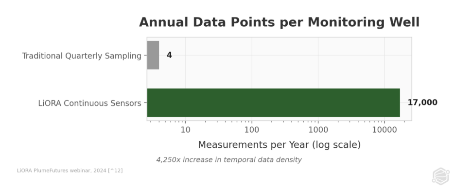 Continuous sensor data changes this math entirely. LiORA's NDIR (Non-Dispersive Infrared) subsurface gas sensors produce approximately 17,000 measurements per sensor per year, sampling every 30 minutes.(8) Across a 40-sensor network, that equals 680,000 data points annually versus 160 from quarterly sampling at the same site. With that data density feeding an automated groundwater model, plume stability can be determined within approximately six months rather than ten to twelve years.(8)