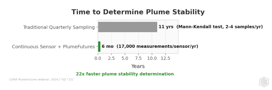 With traditional quarterly sampling - two to four data points per well per year - the Mann-Kendall trend test requires 10 to 12 years to reach statistical significance for plume stability determination.(8) With continuous sensor data providing 17,000 measurements per sensor per year, the same determination can be made in approximately six months.(8) The difference is data density, not modeling sophistication.