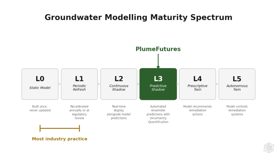 The tools required to reach Level 3 already exist and are free. MODFLOW6, the USGS groundwater simulation standard accepted by regulators across North America, has been open source since the 1980s.(7) PEST++, the parameter estimation software that enables ensemble-based calibration, is also free and open source. The barrier is not technology. It is operational: nobody has automated the pipeline that turns raw site data into a calibrated, uncertainty-quantified groundwater model and keeps it current as new data arrives.